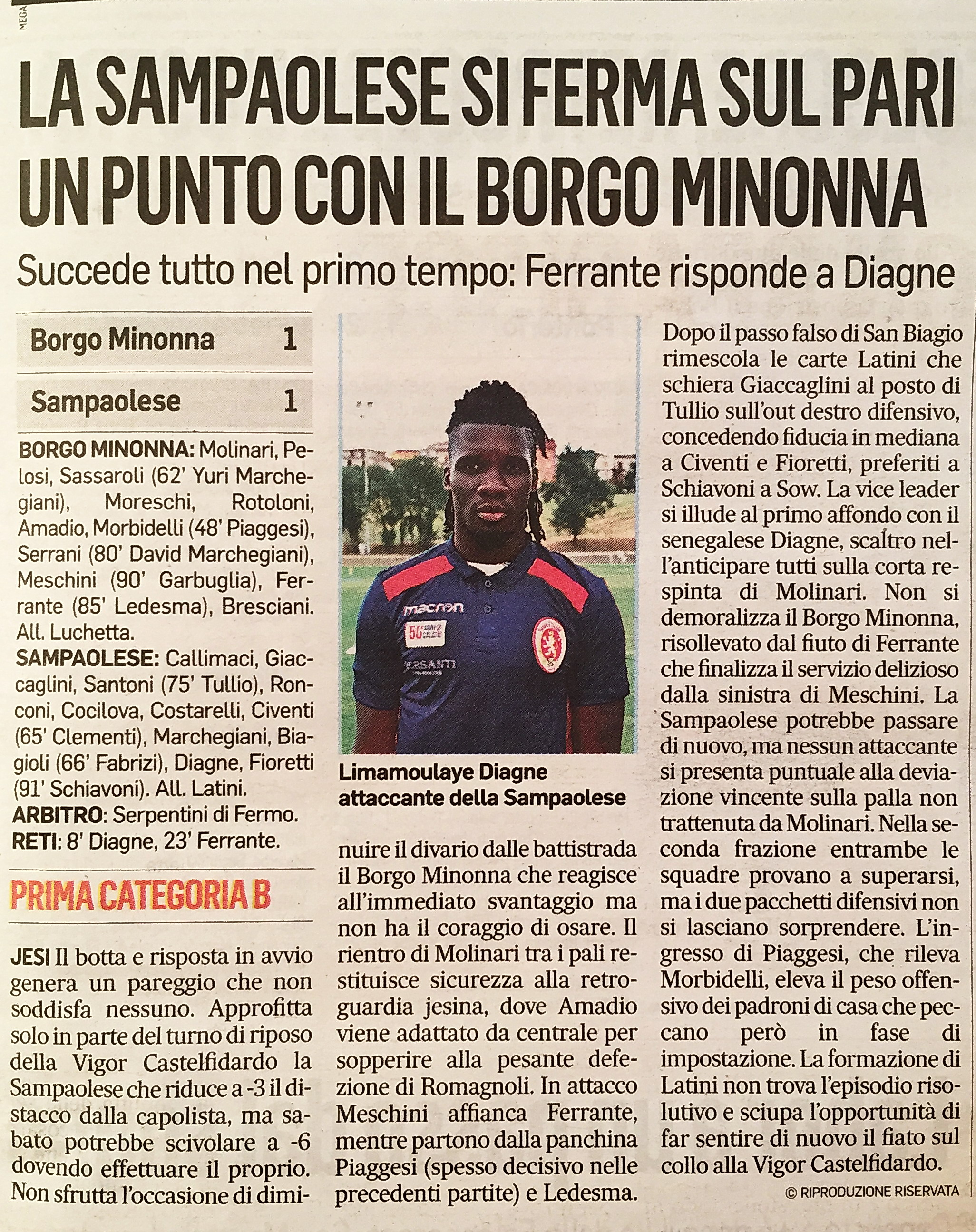 Su un campo insidioso che non permetteva giocate palla a terra, Sampaolese e B.Minonna hanno dato vita ad un incontro di ottimo livello soprattutto nella prima frazione di gioco. Inizia subito forte la Sampaolese che al 3’ è già in vantaggio, bel cross di Giaccaglini, tra i migliori in campo, Molinari respinge corto e Diagne è il più rapido a ribadire in rete di sinistro. Gioca bene la squadra di mister Latini e Biagioli arriva alla conclusione in un paio di occasioni senza però creare troppe difficoltà a Molinari. Al 17’ però il B. Minonna pareggia i conti con Ferrante che è rapido in area a raccogliere una corta respinta di Costarelli e battere Callimaci. Pochi minuti più tardi su una punizione dalla trequarti di Cocilova, Molinari si lascia sfuggire la palla, ma è la traversa a salvarlo e la poca reattività in area degli uomini di Latini. Al 20’ su lungo lancio della difesa è Costarelli a scegliere male il tempo di intervento e concedere a Meschini un ottima occasione che la punta jesina non riesce a sfruttare. Al 22’ è Biagioli che sfrutta ottimamente una torre di Diagne, pronta la girata a rete e miracolo di Molinari che devia la palla sul palo.