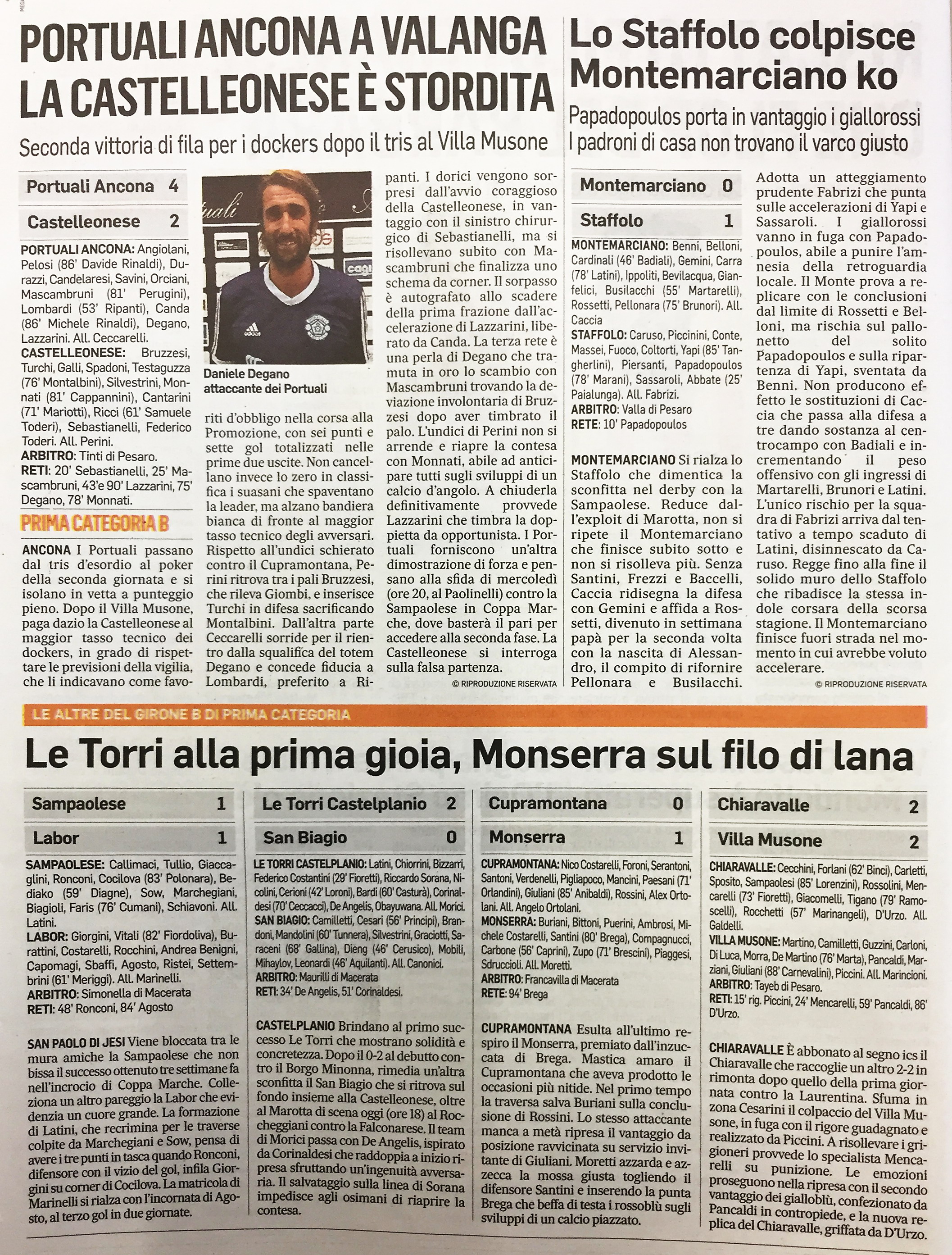 Che il debutto in casa sarebbe stato complicato si era già visto in coppa Marche, la Labor si è dimostrata ancora formazione coriacea e difficile da affrontare. La prima parte dell’incontro risulta equilibrato con le due formazioni che battagliano nella zona centrale del campo. Al 20’ prima grande occasione dei padroni di casa con Marchegiani M. che dai 25 metri lascia partire un sinistro potente che però si stampa sulla traversa. Al 30’ da angolo di Cocilova è Biagioli il più lesto a colpire la palla ma la sua girata finisce al lato. Pochi istanti più tardi due falli ravvicinati in area su Bediako prima e Faris dopo non convincono l’arbitro a decretare il penalty.