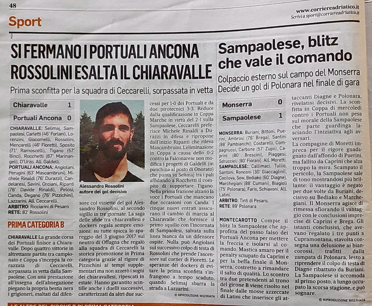 Ripresa che vede la squadra di Latini salire di intensità e pericolosità malgrado il turno infrasettimanale di coppa, e già al 4’ è Biagioli che si vede respingere una conclusione al volo. Qualche istante più tardi, su azione ben manovrata è Bediako che spara a botta sicura dai 10 metri ma Buriani para ottimamente. Al 21’ è Biagioli che salta bene 2 avversari ma poi calcia alto da posizione invitante. Sampaolese che continua a rendersi pericolosa e Monserra che prova a contenere e agire di rimessa. Al 31’ è Marchegiani M. a rendersi pericoloso, prima si vede respingere un tiro da pochi metri dalla porta, e successivamente è Buriani a negargli il gol con un intervento da gran portiere su un tiro forte e preciso. Al 34’ su cross di Giaccaglini è Diagne a deliziare il pubblico con una bella rovesciata, ma la palla finisce di poco alto. Ci prova fino in fondo la Sampaolese e il guizzo vincente lo trova Polonara all’89’ dopo un’incornata di Diagne che il portiere non trattiene. Meritata vittoria dei ragazzi di Latini che con un primo tempo attento e una ripresa sempre votata a cogliere il successo pieno, portano a casa una vittoria importate, la seconda in 2 trasferte, su un campo molto difficile e contro una formazione che ha dimostrato qualità nei suoi uomini e che sarà sicura protagonista di questo campionato.