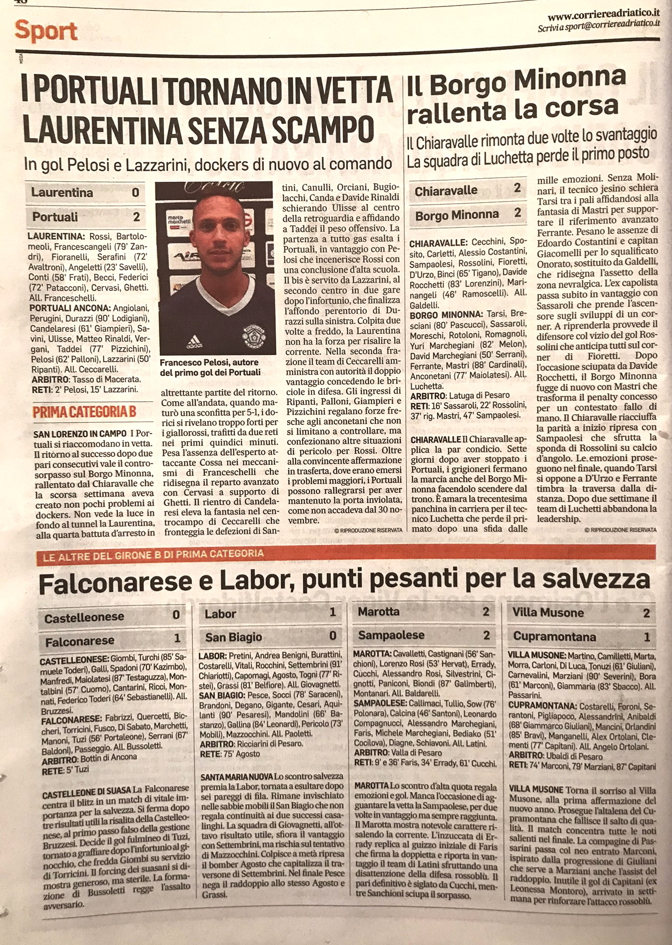 Partita che si preannunciava difficile e così è stato. Campo molto pesante per la pioggia caduta in mattinata, avversario di qualità e molto fisico, rendevano questa partita molto complicata e piena di insidie. Inizio di gara subito acceso e fisico, le due squadre si affrontano e viso aperto. La prima ghiotta occasione è di Bediako che da ottima posizione, colpisce alto di testa, al 9’ la Sampaolese passa in vantaggio con Faris, Schiavoni intercetta una palla, ne nasce un assist per Diagne, la palla finisce successivamente sui piedi di Faris che in un fazzoletto di campo, salta 3 avversari e deposita la palle in rete. Qualche minuto più tardi è Sow ad avere una grande occasione, ma la fallisce a 3 metri dalla porta con un piatto che finisce sopra la traversa. Il Marotta sembra sbandare, ma al 20’ a Paniconi viene annullato un gol per fuorigioco, azione che fa da preludio al pareggio di Erradi al 34’, che da calcio d’angolo anticipa tutti e batte Callimaci. Al 36’ è ancora Faris a portare di nuovo in vantaggio la Sampaolese, tiro dal limite di Schiavoni, il portiere non trattiene e Faris di piatto appoggia la palle in rete.